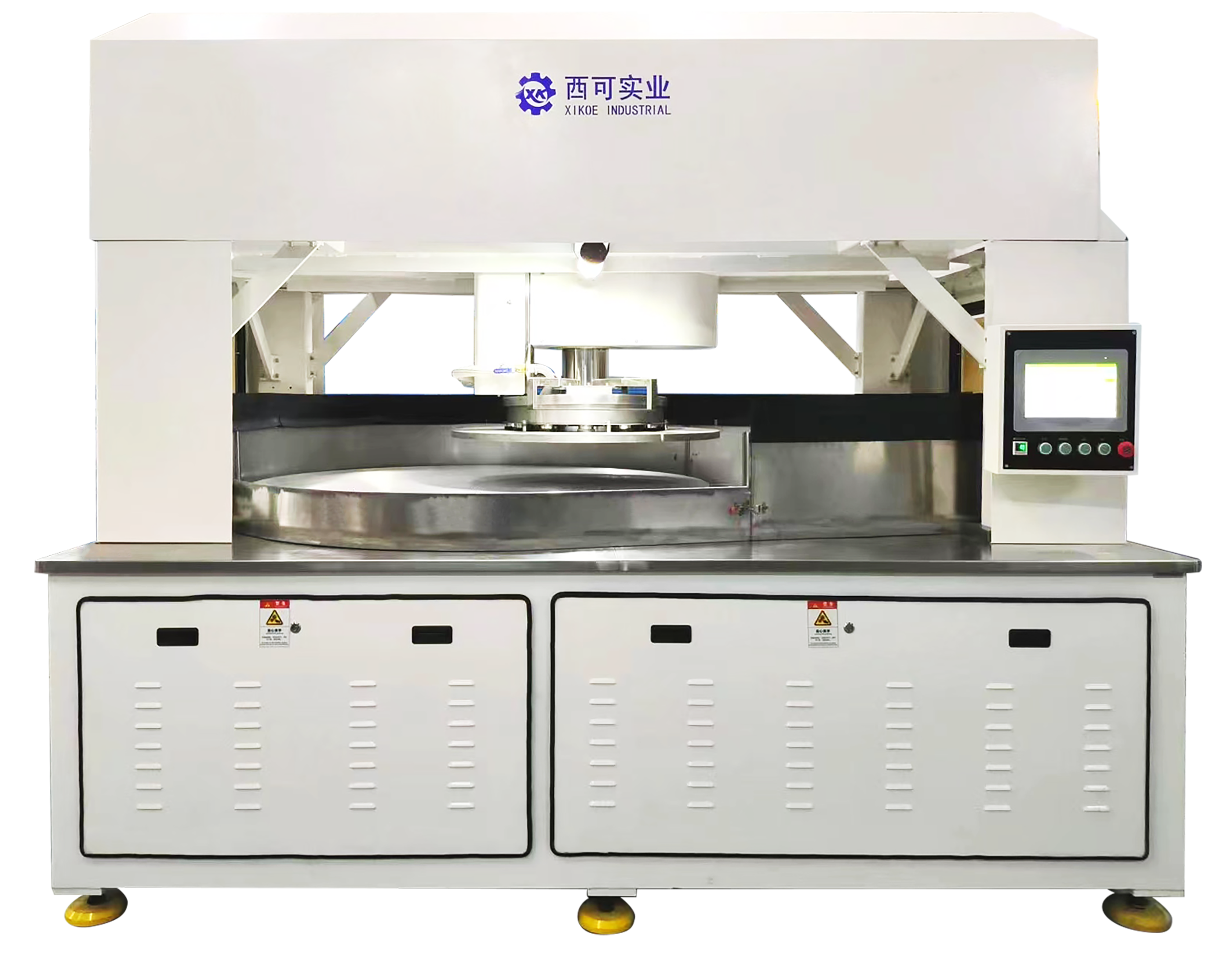 3. 采用上盤掃光盤下盤工件盤的結(jié)構(gòu)布局,能有效防止長時間加工產(chǎn)生的干拋 光液或拋光雜質(zhì)落入地毯造成的劃傷,提升產(chǎn)品良率。